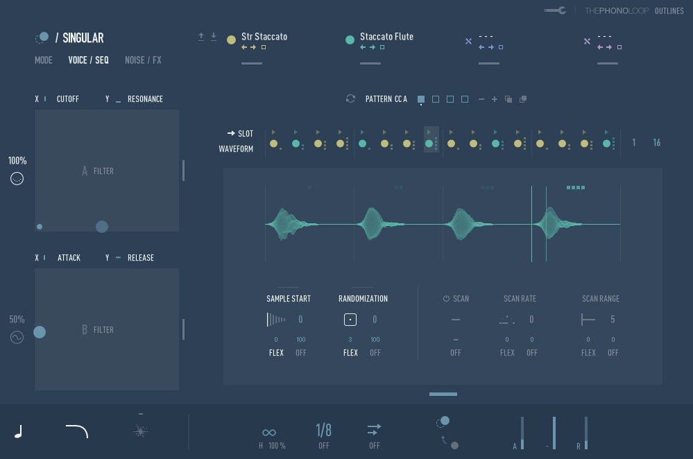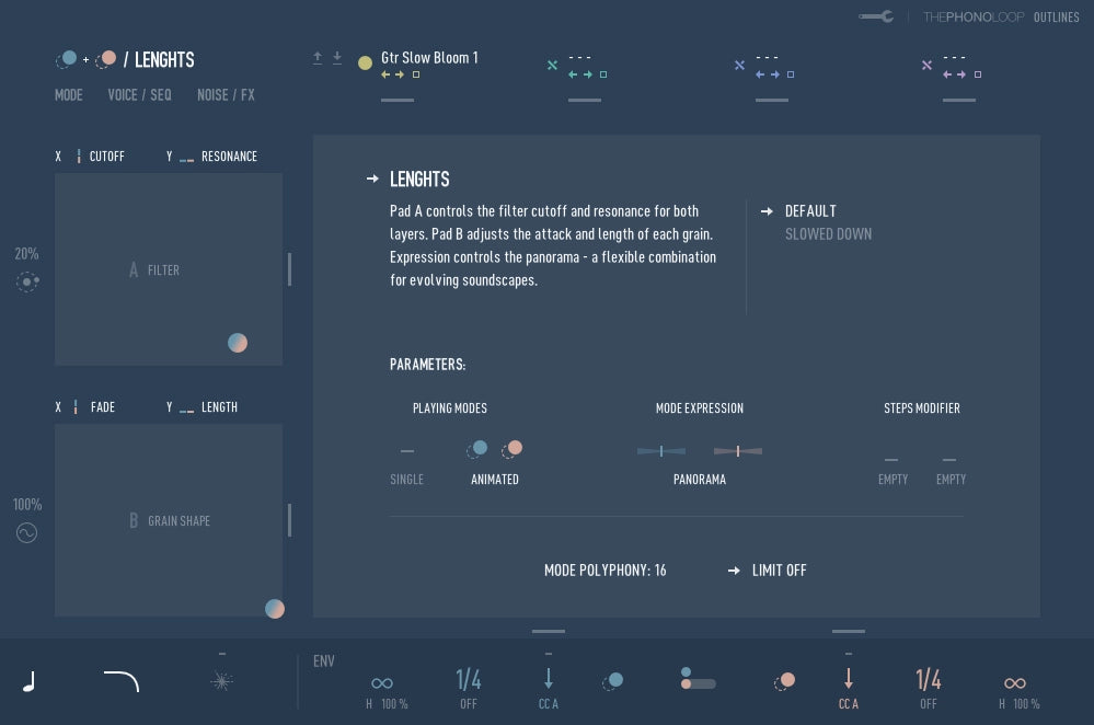 The engine in outlines is built around two independent granular layers, allowing different playback approaches to run side by side. Each layer runs on its own engine, making it possible to combine traditional polyphonic playback with sequenced or granular movement.